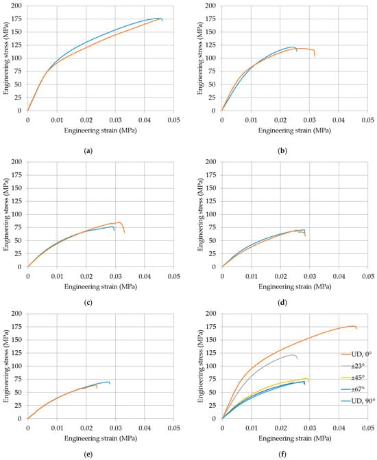 Typical stress–strain results from the tensile tests on the layered samples reinforced with glass fibers: (a) unidirectional 0°; (b) angle-ply ±23°; (c) angle-ply ±45°; (d) angle-ply ±67°; (e) unidirectional 0°; (f) comparison of the tested laminations.