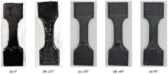 The fiber deposition was carried out to obtain a symmetric, balanced, angle-ply structure according to a [±θ]4s layering scheme, θ being the angle between the longitudinal axial direction of the specimen and the fiber direction. The angle θ = 0 (Figure 2b) corresponds to the fibers aligned to the longitudinal specimen axis, whereas for θ = 90°, the fibers are perpendicular to that axis (Figure 2f). Symmetry was chosen to avoid unwanted coupling of in-plane and bending behaviors; the balanced angle-ply arrangement was chosen to obtain a globally orthotropic structure to avoid coupling of tension with shear behavior. The number of layers was the minimum to obtain a sufficiently homogenized structure.