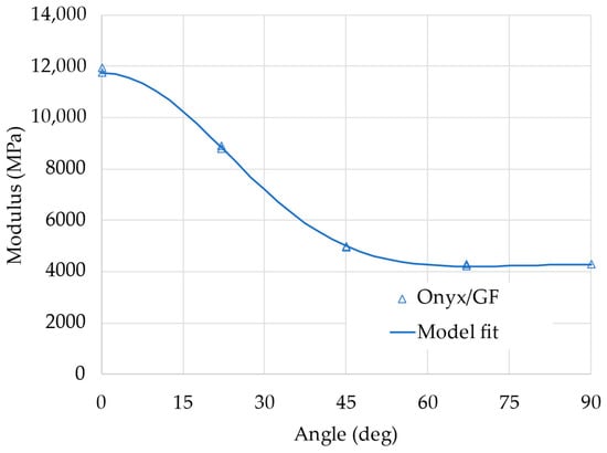 The apparent elastic modulus of the samples with different fiber orientations depends on the elastic properties of the layers and on the angle, following the relations described by Equations (1)–(10). The layers’ elastic properties can then be estimated with a non-linear regression analysis by minimizing the square error between the experimental values of the apparent modulus and the value calculated by the model (from Equation (10)). Results from this analysis are reported in Figure 6; the curve represents the non-linear fit of the model, showing a very good correlation with the experimental data.
