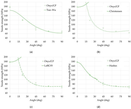 Experimental results of the tests on Onyx/GF samples in tension. Analysis of the strength and criteria: (a) Tsai–Wu model; (b) Christensen model; (c) LaRC05 model; (d) Hashin model.