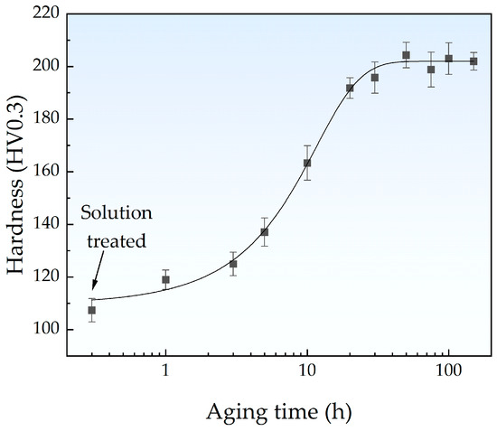 The solution-treated alloy was cut into small rectangular sheets of 70 × 12 × 1 mm3 for the following heat treatment. To accelerate the precipitation of Cu atoms, it is generally necessary to keep the isothermal aging temperature at 500 °C [27]. Aging at lower temperatures allows us to observe the early stages of precipitate formation and the fine-scale microstructure evolution. Referring to our previous research [28], the sheets were aged at 450 °C for different durations, then air cooled to room temperature. The heat treatment process in this study is shown in Figure 1. At least four parallel samples were prepared for subsequent testing and characterization for each processing duration. Vickers hardness tests were performed on the mechanically polished surface of specimens using a Vickers microhardness tester (Mega Instruments, Suzhou, China, AutoVicker 1000AF) with a load of 300 gf. The hardness value for each specimen was obtained by averaging the repeated measurements taken from ten different points on the surface.