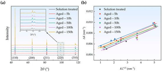 The XRD patterns of the samples in different states are shown in Figure 3a. The Miller indices of each diffraction peak are labeled in Figure 3a, and it is evident that the Fe-Cu alloy maintained a single-phase α-Fe structure throughout the aging process. The peak broadening of X-rays attributed to strain has long been investigated in connection with dislocation density [33]. Williamson and Hall [34] proposed a series of equations for calculating dislocation density using XRD peak width, known as the Williamson–Hall (WH) method. This method separates the broadening of diffraction peaks into two contributions—one due to the finite size of the crystallites (size broadening) and the other due to the lattice strain caused by dislocations (strain broadening). This method is beneficial for characterizing the evolution of dislocation density in Fe-Cu alloys during aging since the contributions from size broadening can be ignored for coarse-grained materials [30]. Ungar et al. [35,36] further considered the peak width anisotropy caused by dislocations and derived the modified Williamson–Hall (MWH) method. The MWH method was employed in this study to calculate the dislocation density in the Fe-Cu alloy. The relevant equations are as follows [35,36]: