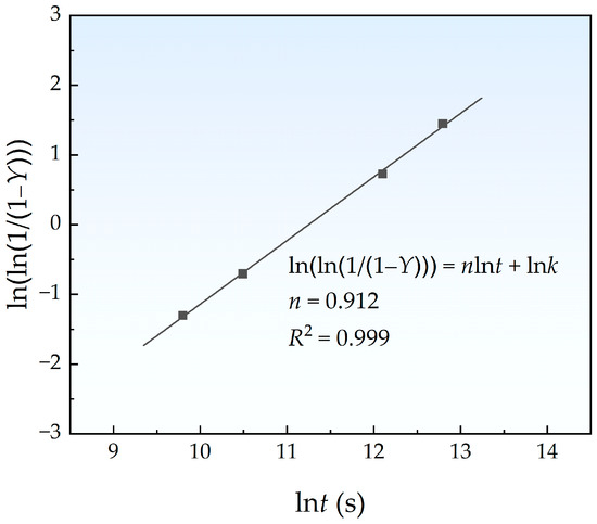 where, in this work, Y can be calculated from the volume fraction Vf via . k is the rate constant that varies with temperature and n is a temperature-independent constant depending on nucleation modes. The lnln(1/(1 − Y)) vs. lnt plots are shown in Figure 8, and the R2 of linear fitting was 0.999. The value of n calculated from the slope was 0.912, which is in good agreement with those results (n < 1) obtained from the experimental [10] and Monte Calo simulation [11] studies.