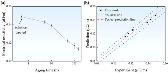 (a) Variation in electrical resistivity for the Fe-Cu alloy samples with aging time. (b) Comparison between the experimental and predicted electrical resistivity of the solution-treated and aged samples. The blue line represents the 5% absolute percentage error (APE) line, while the red line represents the perfect prediction line.