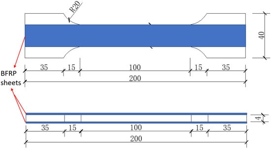 Figure 2 presents the specific dimensional parameters of the composite plates. The thickness of the steel plate for all specimens is uniformly 4 mm. The dimensions of the steel plate were determined in accordance with the standard ISO 6892-1:2019 [25]. The BFRP sheets are rectangular strips measuring 200 × 20 mm and are symmetrically bonded to both sides of the steel plate.
