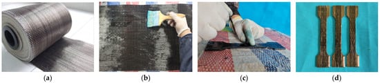Figure 3 illustrates the preparation process of the composite plates. First, dry fabric of appropriate dimensions is cut from the BFRP roll (Figure 3a). The surface of the steel plate is then cleaned to remove dust and rust. The BFRP fabric is fully impregnated with epoxy resin adhesive (Figure 3b). The impregnated BFRP fabric is accurately bonded to both sides of the steel plate (Figure 3c). For specimens with multiple layers of BFRP, this process is repeated. After 48 h, the epoxy resin adhesive cures, completing the preparation of the specimen (Figure 3d).