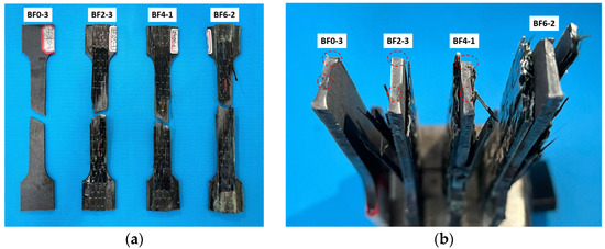The tensile failure mode of the BF0 series specimens is shown in Figure 4a. The failure of the steel occurred through necking and ductile fracture, characterized by a localized reduction in cross-sectional area (necking zone). The fracture surface exhibited a fibrous appearance. This behavior is consistent with the findings of most previous studies [27,28,29].