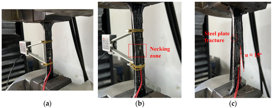 As the load increased, a noticeable necking zone developed at the center of the composite plate (Figure 7b). Both the steel plate and the BFRP sheets exhibited a significant reduction in cross-sectional area, indicating that the composite plate had entered the plastic loading phase.