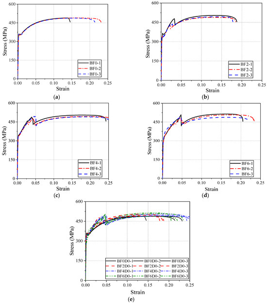 Figure 8c,d shows the stress–strain curves of specimens with two and three layers of BFRP sheets bonded to each side of the steel plate, respectively. Compared to the BF2 series, no significant differences are observed in the elastic stage for the BF4 and BF6 series. The yield section transitions from a plateau to a smooth, sloping curve, presenting a bilinear characteristic. In the strengthening stage, all three series exhibit a similar secondary strengthening trend, and, as the number of BFRP layers increases, the slope of the strengthening section remains unchanged. However, the fracture strain is significantly increased (see Figure 8e). Therefore, the maximum stress of the composite plates is increased in the strengthening section, but the maximum tensile stress during the necking stage is similar for all specimens.