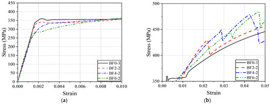 Figure 9b magnifies the slope of the strengthening stage curve. To avoid the influence of BFRP fracture, the slope is calculated for the strain range of 0.025–0.035. The strengthening stiffness of BF0, BF2-2, BF4-2, and BF6-2 is 1772.9 MPa, 2050.0 MPa, 2215.8 MPa, and 2837.1 MPa, respectively. This indicates that bonding two, four, and six layers of BFRP sheets increased the strengthening stiffness by 15.6%, 25.0%, and 60.0%, respectively, compared to pure steel.