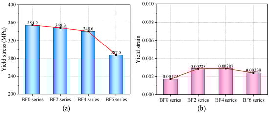 Figure 10 presents the yield-point data for each series of specimens. For reinforced specimens, the yield stage is represented by a transitional curve. The method for determining the yield point is to select the endpoint of the transitional curve, which corresponds to the starting point of the linear strengthening stage. From Figure 10a, it can be observed that, as the number of BFRP layers bonded to both sides of the steel plate increases, the yield stress shows a decrease of 1.7–18.8%. This is likely because, at the yield stage of the composite plate, both the BFRP and the steel share the load, but the relatively low elastic modulus of the BFRP sheets prevents them from fully exhibiting their high-strength characteristics at low yield strains. In this case, the BFRP sheets cannot exceed the yield strength of the steel, thereby weakening the composite plate’s overall yield strength. However, the yield strain exhibited a slight increase. The yield strain of the BF6 series is 1.39 times that of the BF0 series. This indicates that, when a sufficient number of BFRP sheets are bonded, the yield deformation capacity of the steel plate can be enhanced, but the yield stress will decrease. This finding is crucial for the performance design of composite material plates, making them suitable for structures that require greater deformation capacity. This will determine the serviceability limit state of composite plates.