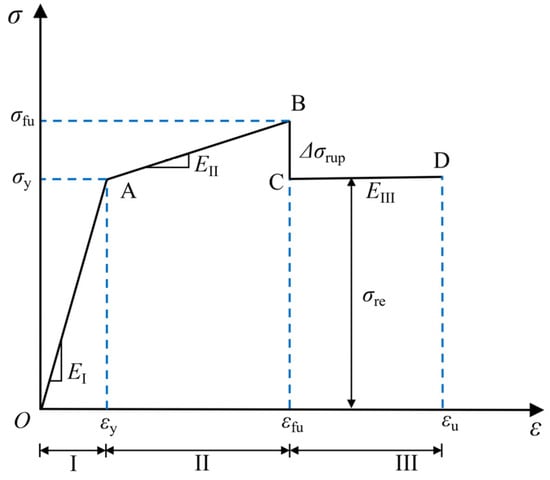 Residual Segment CD: After the BFRP fracture, the stress at point B drops sharply to point C and then keeps constant until the steel fracture point D. Therefore, the slope of the curve in segment CD is zero. The CD segment is essentially the necking stage of the steel. The stress loss due to BFRP fracture, Δσrup, can be calculated using Equation (6). The coefficient in the formula is derived from a statistical regression of the stress loss observed after the fracture of different numbers of BFRP layers. When the number of BFRP layers increases from 1 to 3, the corresponding stress losses are 35.1 MPa, 60.5 MPa, and 67.6 MPa, respectively. It is important to note that, due to the limitations of the sample characteristics in this study, Equation (6) is only applicable to BFRP types. This allows for the determination of the location of point C. The position of point D can be determined using the steel fracture strain εu.