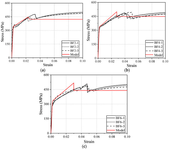 Figure 13 presents a comparison between the experimental data and the calculated stress–strain relationships for the BF2 series (a), BF4 series (b), and BF6 series (c), aiming to evaluate the accuracy and applicability of the model’s predictions. As shown in the figure, the model is able to roughly describe the material’s initial linear response behavior. In the post-yield strengthening phase and the residual phase, the predicted data align with the overall trend of the experimental data. However, some deviations are observed in specific regions, particularly near the peak stress and the yield point. The experimental data for the BF2 series show good consistency, and the model’s predictions are most accurate for this series; the BF4 and BF6 series exhibit slightly increased variability, with the model showing deviations in localized regions. These discrepancies are primarily attributed to the inherent variability of the BFRP material, leading to unstable fracture strains. Overall, the model demonstrates high applicability in describing the elastic and plastic behavior of BSBCPs.