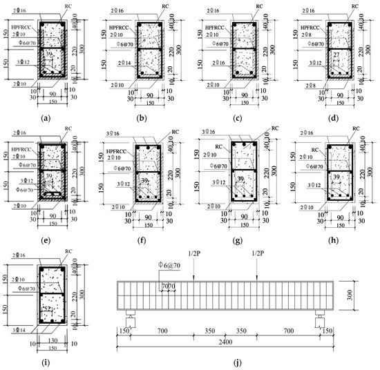 Dimensions of composite beam models. (a) HPSTD1.21R; (b) HPSTD1.13R; (c) HPSTD1.36R; (d) HPSTD1.07R; (e) HPSTD1.21R-W; (f) HPREV1.46R; (g) RCREV1.46R; (h) RCSTD1.21R; (i) ZSTD1.11R; (j) Longitudinal section of the beam.