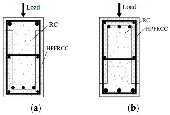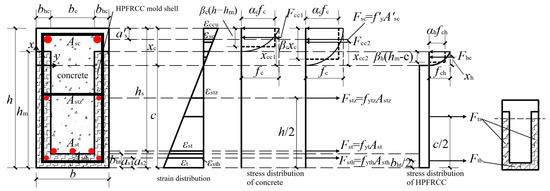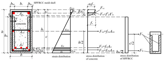 where: σcc(ε) was the concrete compressive stress; σch(ε) was the HPFRCC compressive stress, which Equations (4) and (2) can determine; hm was the height of the HPFRCC side mold shell; c was the distance from the bottom plate of the R/HPFRCC mold shell to the neutralization axis; and x was the distance from the position of any point in the pressure zone to the neutralization axis.