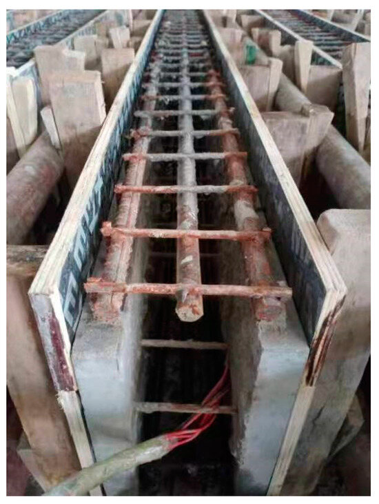 The pouring process of the specimen is as follows: firstly, the steel mesh was welded and poured together with the U-shaped HPFRCC mold shell or ordinary concrete mold shell. After curing the shell, the conventional concrete was poured with the post-reinforced steel bars, as shown in Figure 3.