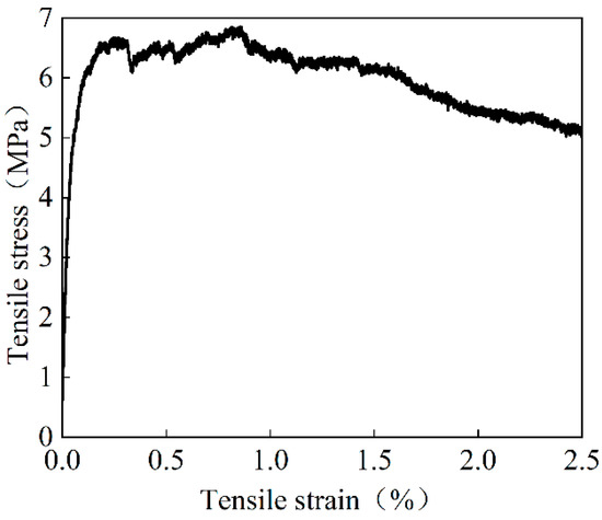 The cement, fly ash, quartz sand (with particles ranging in size from 0.06 to 1.18 mm), PVA fiber, superplasticizer, and water made up the majority of HPFRCC, a cement-based composite material. The HPFRCC material contained 2% of PVA fiber by volume. The polyvinyl alcohol fiber, known as KURALINK-II-12 mm, has the following specifications: 40 μm fiber diameter, 12 mm fiber length, 7% elongation, and 1600 MPa tensile strength. The 100 mm × 100 mm × 100 mm cube blocks and 100 mm × 100 mm × 300 mm prism blocks were tested to obtain a cubic compressive strength of 50.9 MPa and an average axial compressive strength of 40.2 MPa for HPFRCC. The average tensile strength for HPFRCC was 6.85 MPa, as presented in Figure 4. The concrete was made of commercial concrete, and the basic mechanical properties of ordinary concrete were measured according to the standard for test methods of concrete physical and mechanical properties [18]. The average compressive strength of the cube was 49.3 MPa, and the average compressive strength of the prism was 38.2 MPa. The average value of the measured mechanical parameters of the steel bar is shown in Table 2.