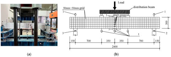 Schematic diagram of the testing device. (a) Layout of test setup (beam front); (b) Test setup and measurement points (unit: mm, 1—displacement sensor; 2—Hing support; 3—Fixed hinge support).