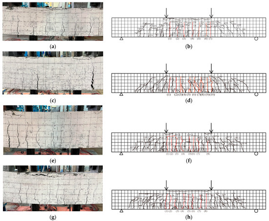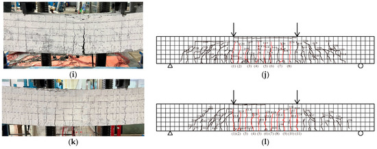 Fracture state and crack distribution. (a) HPSTD1.21R failure state; (b) HPSTD1.21R crack distribution; (c) RCSTD1.21R failure state; (d) RCSTD1.21R crack distribution; (e) HPSTD1.13R failure state; (f) HPSTD1.13R crack distribution; (g) HPSTD1.36R failure state; (h) HPSTD1.36R crack distribution; (i) HPSTD1.07R failure state; (j) HPSTD1.07R crack distribution; (k) HPSTD1.21R-W failure state; (l) HPSTD1.21R-W crack distribution.