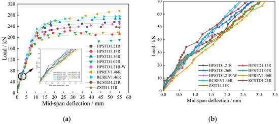 For the R/HPFRCC composite beam (HPSTD1.21R-W), which used reinforcement mesh as the longitudinal reinforcement of the cast-in-situ portion of the composite beam, the loading system was not identified as the trial stage because it was the first test, and the displacement loading was stopped after loading only 50 mm. Additionally, because the beam HPSTD1.21R-W was made with a construction error at first, the beam had to be reproduced. However, beam HPSTD1.21R-W ’s yield load and peak load were 5.2% and 2.89%, respectively, lower than those of beam HPSTD1.21R. It may be irrational to compare them to those of other beams. The test’s data may be accumulated as test data only.