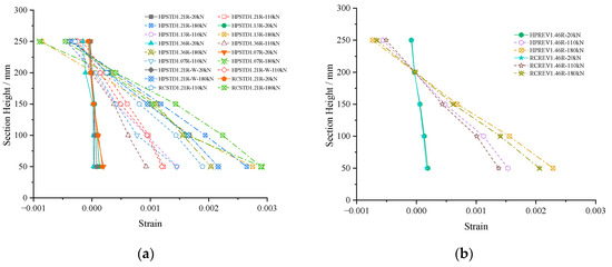 The mechanical analysis of the R/HPFRCC precast shell composite beam flexural bearing capacity is based on the plane section assumption theory. In this experiment, five concrete strain gauges (see Figure 5b) were arranged at equal distances in the middle section of the composite beams to monitor the strain change of the shell material. The measured strain gauge data were plotted along the beam height, as shown in Figure 9a. The strain values of specimen HPSTD1.21R (the shell was HPFRCC material) were slightly smaller than that of specimen RCSTD1.21R. When the beam top was under tension, the strain of the specimen HPREV1.46R was also a little smaller than that of RCREV1.46R (Figure 9b). As the load increased, cracks continued to appear, and the measured strain values were partially deviated and no longer in a completely linear state. However, from an overall trend perspective, the strain values varied approximately linearly along the beam height. This was in line with the plant section assumption and provided a basis for the theoretical and mechanical analysis of the subsequent flexural bearing capacity of the R/HPFRCC composite beams.