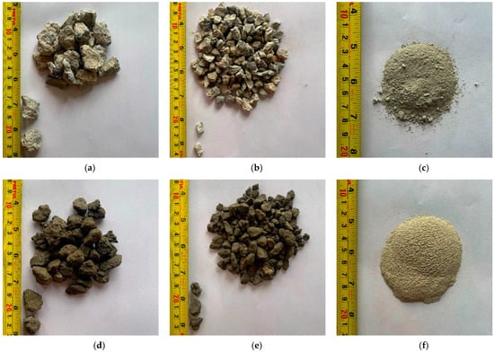 Matrix components of the RPCs under study. (a) 3/4” RCA; (b) 3/8” RCA; (c) Cement CPC 30R; (d) 3/4” RAP; (e) 3/8” RAP; (f) Silica sand smaller than sieve no0.