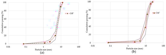 Particle-size profile of RA used in the development of the RPC mixes. (a) 3/8” RA; (b) 3/4” RA. The continuous black line shows the maximum and minimum acceptable limits according to regulations [40].