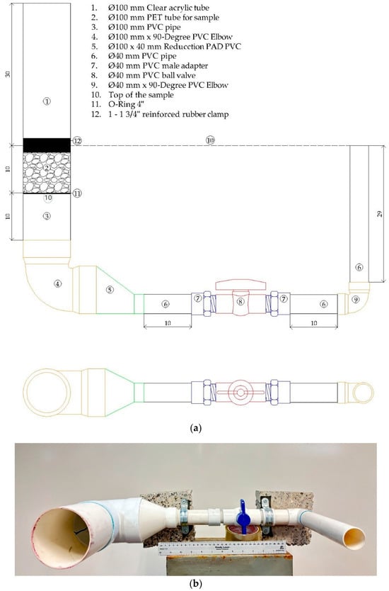 Permeameter prototype developed for permeability testing. (a) Prototype schematic (dimensions in cm); (b) Permeameter.