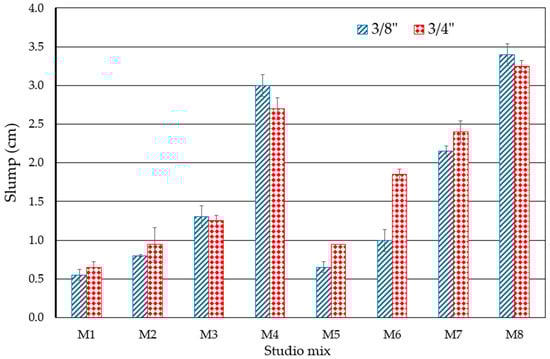 The slump of the RPC mixtures is shown in Figure 6, showing how the W/C ratio can affect their behavior, causing, for example, in cases of W/C = 0.35, the mixtures to flow more and even exceed the acceptable slump limits [50], as evident in the M4 and M8 samples. However, in general terms, variables with a W/C = 0.26 do not do so, for example, in the M1 and M5 samples. Regarding the size of the particles studied (3/4” and 3/8”), it has been shown that the stone structure of the concretes (their particle sizes, their distribution, etc.) affects the behavior of the slump [51]; in this work, the samples with a larger particle size (3/4”) improve the increase of their slump in general terms. Finally, the results of the samples are divided into two large groups related to each other: those whose matrix does not include the fine aggregate of silica sand (particles < sieve #30), which includes samples M1 to M4, and those whose matrix includes 10% of the fine aggregate of silica sand (particles < sieve #30), which includes samples M6 to M8. In both cases, the increase in the design porosity percentage of the mixtures is directly correlated with the increase in the slump; this can be understood if it is considered that these holes facilitate the mobility of the mixture particles in their fresh state [52].