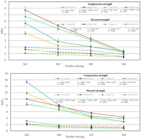 In terms of strength capacity, the results of the compression tests of the RPC with RCA and RAP RA show low strengths, both for compression and bending (see Figure 6). The M5 3/4” is the only mix that exceeds a higher compressive strength of 10 MPa (15.39 MPa). However, it is true that in this group of samples containing silica sand, the minimum requirement established by the IMCYC [50] (3.5 MPa) is satisfied. In terms of flexural strength, for the M5 to M8 grouping, the minimum acceptable limit—1 MPa—is also practically satisfied (only M8 is very close to satisfying it); while only M1 satisfies it in the other group.