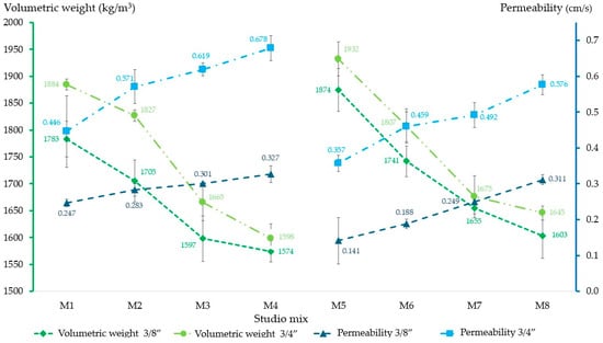 When analyzing the results of permeability and volumetric weight in Figure 8, it can be seen that these physical properties are inversely proportional: when permeability is high, volumetric weight is lower. On the other hand, the permeability index in the M5 3/8” and M6 3/8” mixtures is below the limit established by ACI 522R-10 since the pores that allow the passage of water are closed or obstructed. In general terms, the study samples establish permeabilities within the permitted range—0.20 to 0.54 cm/s—, but when comparing mixtures that include 3/8” RA with those that use 3/4”, the latter present a degree of filtration that is twice as much as the former. The permeability index is also affected by the quality of the cement paste since, in mixtures where silica sand was used—M5 to M8—the cement paste produced by the sand significantly reduces or closes the pores, causing lower filtration rates.