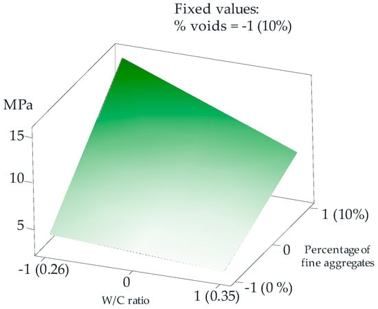 As the main objective of this research is to find an optimal mix design for maximum compressive strength, the most statistically significant results were established for 3/4” RA when the percentage of voids was kept at the low value, 15% (value assignment −1). With this value assigned and fixed, a surface graph was obtained, which shows that the factor of the W/C ratio = 0.26 (value assignment −1) and the 10% of fines (assignment of value 1) are optimal for achieving the highest feasible resistance. Figure 9 graphically demonstrates the above and shows the behavior of the compressive strength when the values of the factors of the W/C ratio and percentage of fine aggregate are not at their optimal point.