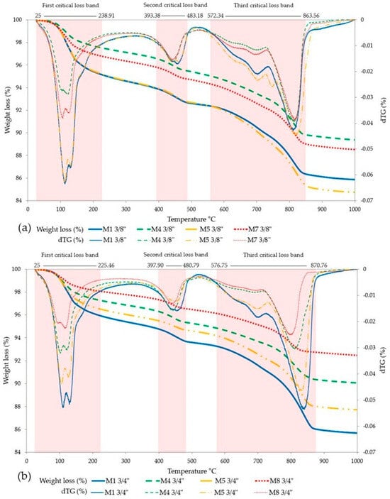 After obtaining the results and comparing the weight loss and area under the curve of the mixtures 3/8” RA against the mixtures 3/4” RA (Figure 11), it was determined that the weight loss is greater when 3/8” RA is used. This shows that the choice of mixtures with 3/4” RA as optimal, through analysis of the factorial design 23, is consistent with the structure of their matrices being more stable at increases in temperature. Therefore, they are more resistant (but only if the size of the RA is taken into account as an incidence factor). However, these differences are greater when silica sand is added to mixtures of RPC with RA, which can be directly attributed to the main component of the sand (silica). In numerical terms, the comparison of the mixtures (M1 3/8” vs. M1 3/4”, M4 3/8” vs. M4 3/4”, M5 3/8” vs. M5 3/4” and M7 3/8” vs. M8 3/4”) establishes a difference in weight loss of more than 10% for each comparison of the cases studied.
