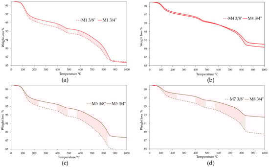 Comparative thermogravimetric analysis. (a) M1 3/8” vs. M1 3/4”; (b) M4 3/8” vs. M4 3/4”; (c) M5 3/8” vs. M5 3/4”; (d) M7 3/8” vs. M8 3/4”.