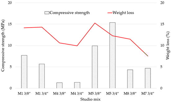 As shown in Figure 12, the lower percentage of weight loss is linked to low compressive strength; however, a higher percentage of weight loss due to calcination of the components does not establish with certainty a better compressive strength since higher compressive strength results are also the variables that established the values of material loss by calcination at greater than 10%.
