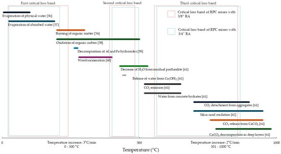 The mechanical behavior of the RPC mixtures depends to a large extent on the different compounds that compose the matrix; evidently, the most-found compound is water (H2O) since, according to the diagram in Figure 13, it is included in different layers. Likewise, in this diagram, it is observed that not all the elements that are volatilized are located in the critical loss bands; some of them, such as wood and organic matter, are found outside. Nevertheless, in most cases in which an RA is used, traces of wood and plastics, among others, are likely to be found.