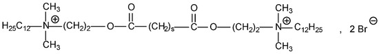 Tetraethoxysilane (TEOS, 99%, for analysis, Merck & Co., Inc., Rahway, NJ, USA), ethanol (99%, SC Mobil Dacami SRL, Simeria, Romania), ammonia solution 25% (Silal Trading SRL, Bucharest, Romania), hydrochloric acid ~37% (Sigma-Aldrich, Schnelldorf, Germany), and diester gemini surfactants were used for the synthesis of the mesoporous silica. The diester gemini surfactants C12-s-12 were synthesized by the reaction of alkane-diylbis (bromoethylacetate) with dimethyl-dodecylamine. Their molecular structure is shown in Figure 1. More details are given in the original publication of Pisárčik et al. [17].