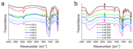For the xerogel samples, the peak positions were similar for the materials prepared with the gemini surfactants of different spacer lengths (Table 3). The first diffraction peak appeared at q(01) = 2.03 ± 0.005 nm−1, which corresponds to lattice spacing of 3.11 nm. This is the expected behavior for surfactant-templated ordered porous silica, as the pore size and the lattice parameter are determined by the surfactant alkyl tail, which is similar for all six compounds. Calcination and the treatment with acidified ethanol caused a shrinkage of the hexagonal structure, similar to the behavior of MCM-41 prepared with an alkyl-trimethylammonium micellar template [33,34,35,36,37,38]. Interestingly, this shrinkage was markedly different among the materials prepared with the gemini surfactants with different spacer lengths. The degree of shrinkage shows the structural strength of the silica framework and was the highest for the samples S-e3-e and S-e3-540, prepared with a relatively short spacer surfactant (Figure 8b). During calcination, the micellar template was fully eliminated, according to the IR spectra and the BET-specific surface, whereas solvent removal was not as efficient, leaving a fraction of the surfactants in the material. Furthermore, the solvent removal partly destroyed the hexagonal pore structure, as seen by the disappearance of the higher-order reflections.