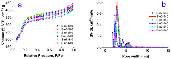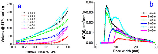 The N2 adsorption–desorption isotherms are shown in Figure 3a and Figure 4a. All materials present a type IVb isotherm according to the IUPAC classification. Type IVb is specific for mesoporous materials having conical or cylindrical pores, closed at one end [29,30]. The presence of hysteresis indicates that pore condensation takes place. The narrow hysteresis loop closing near 0.2 P/P0 suggests the presence of some wide pores that could have more access to the external surface [30]. A H2(b) type hysteresis has been observed for all samples. This type of hysteresis is encountered in samples where pore blocking takes place and pores have the shape of ink bottles with larger necks [29,30].