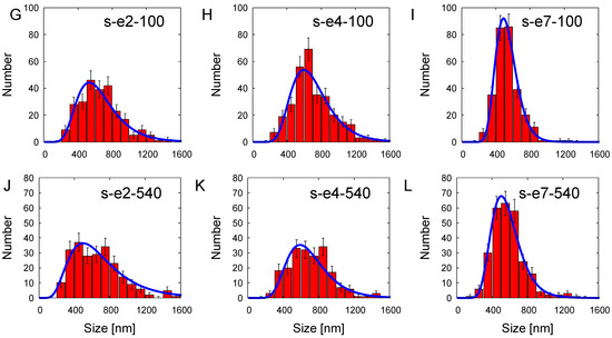 SEM micrographs and particle size distribution histograms for the as-prepared and calcined samples. The solid lines are fits of log-normal size distribution. (A,G): S-e2-100; (B,H): S-e4-100; (C,I): S-e7-100; (D,J): S-e2-540; (E,K): S-e4-540 and (F,L): S-e7-540.
