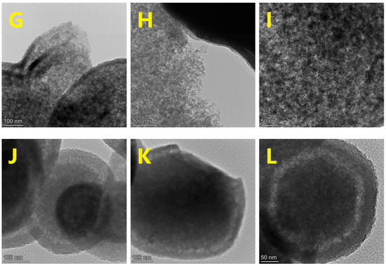 TEM analysis was conducted on four samples selected to represent the materials prepared using the gemini surfactants with short, medium, and long spacer lengths. Most of the images revealed particles in the size range of 0.5–1 µm. Selected samples are shown in Figure 6. The samples appear to have spherical or slightly elongated morphologies, and in some cases, broken or fractured particles can be seen (Figure 6B,D,G). Some particles have a darker core surrounded by a two-layer shell (e.g., Figure 6B,D), and can be considered as partially hollow spherical particles, showing similarity with the smaller and more regular hollow spherical particles reported by Li et al. [15].