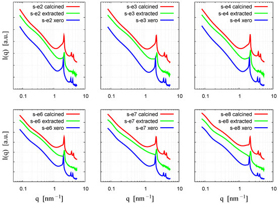 The small-angle diffraction patterns for the three series of xerogels, calcined materials, and solvent-extracted materials are shown in Figure 7. All samples show two characteristic features: a steep power-law-like decay in the small q range, and a series of sharp diffraction peaks in the high q range. The power-law decay is due to the interface scattering of large silica particles, common to the materials obtained in the Stöber process [32]. The broad wave in the q range 0.2–1 nm−1 reflects the ~10–50 nm size inhomogeneity in the particle structure, which can correspond to the ~15 nm sized domains observed in the TEM.