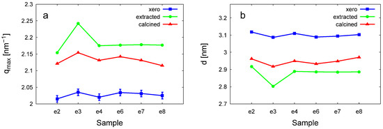 The three sharp diffraction peaks at q values proportional to 1:√3:2 can be indexed as the reflections corresponding to the (10), (11), and (20) lattice planes of the two-dimensional hexagonal lattice. These peaks reveal a well-organized crystalline structure, which can be identified as that of MCM-41 materials [31,32,33,34,35]. The peak positions and the corresponding lattice spacings are shown comparatively in Figure 8 and listed in Table 3.
