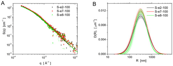 USANS data for samples S-e2-100, S-e7-100, and S-e8-100 and fits of the form factor of spherical particles with log-normal size distribution (A). The obtained size distributions (B).