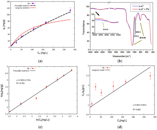Adsorption isotherms of sample S-e7-540 for Pb(II) at T = 25 °C. (a) Experimental data and non-linear least square fit curves to Langmuir and Freundlich model equations; (b) FTIR spectra of the sample before and after sorption; (c,d) linear representation and linear fits to Freundlich and Langmuir isotherm equations.