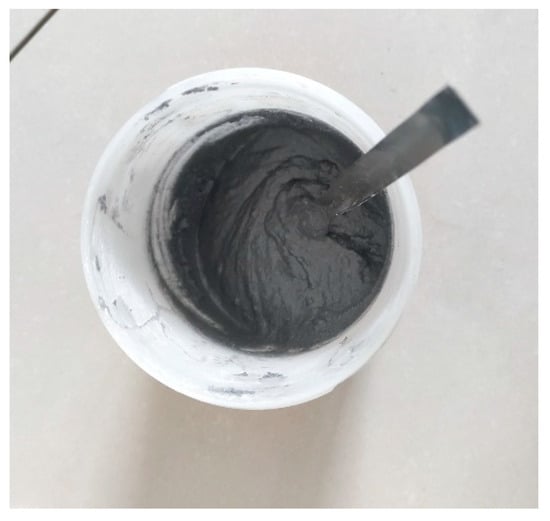 After weighing, the materials were dispersed using a non-intrusive material homogenizer (ZYMC-180HV, Shenzhen Zhongyi Technology Co., Ltd, Shenzhen, China) for 5 min at 1000 rpm. They were then subjected to vacuum treatment for 1 h to obtain a uniformly mixed composite solid propellant slurry, as shown in Figure 1.