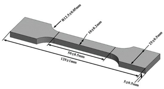 The rheological properties of the propellant paste were tested at room temperature (25 °C) using a rotational rheometer (MCR302, Anton Paar, Graz, Austria). A parallel plate geometry with a diameter of 25 mm and a 1 mm gap was selected, with shear rate measurements conducted over a range of 0.01–200 s⁻1. To compare the micromorphology of propellants printed using plunger and screw extrusion methods, field emission scanning electron microscopy (FE-SEM, MIRA II LMH, Tescan, Brno, Czech Republic) was employed to analyze the cross-sectional morphology of printed samples, allowing for detailed observation of pores and their distribution. Additionally, micro-computed tomography (YXLON, FF20 CT, Hamburg, Germany) was used to examine the distribution of internal defects within the samples. To assess the mechanical properties of propellant samples printed using plunger and screw extrusion, tensile tests were conducted at 20 °C using a universal tensile testing machine (INSTRON 5969, Instron, Norwood, NY, USA) with a crosshead speed of 2 mm/min. The tensile test specimens were dumbbell-shaped (Figure 2) with parallel-section dimensions of 10 mm × 5 mm. Each group of experiments printed 6 specimens, and we used 3M P240 sandpaper and referred to the dimensions and tolerance requirements provided in Figure 2 to perform the sanding process, with no visible surface defects before being tested. Each set of tensile tests ensured that there were at least 3 sets of relatively consistent experimental data. In addition, cylindrical grain configurations with a concentric filling pattern were chosen as the method for forming the samples, in order to minimize defects caused by path planning and to facilitate a more straightforward and intuitive comparison of the forming effects between the screw and plunger methods.