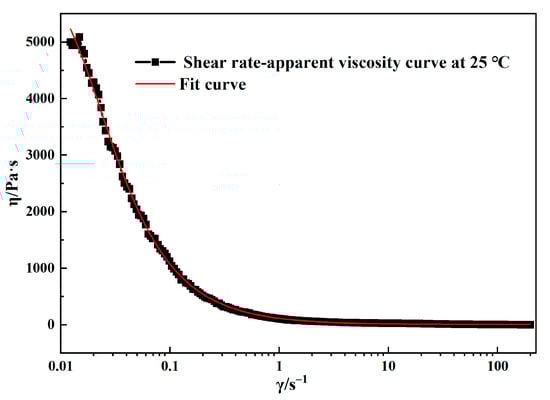 Using a rotational rheometer, a curve representing the variation in viscosity of the surrogate material with respect to shear rate was obtained, as shown in Figure 3. In a steady-state flow environment, the Carreau constitutive model effectively captures the relationship between shear rate and viscosity for this material. Specifically, the Bird–Carreau model is well suited for describing rheological properties across a broad range of shear rates []. The fitted curve for the surrogate solid propellant material aligns closely with the experimental data, showing a correlation coefficient of 0.9928. Therefore, the Bird–Carreau model was selected for subsequent simulations to represent the rheological properties of the propellant slurry. The fitting function is provided in Equation (1):