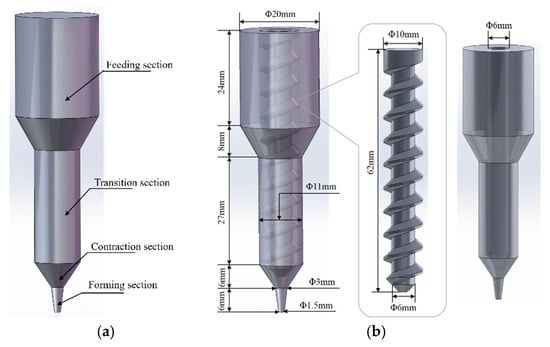 The extrusion process of the propellant slurry was simulated using ANSYS/POLYFLOW 2022R1 software. Figure 4 presents detailed dimensional models of the 3D printer extrusion mechanisms, featuring both plunger and screw structures. In the diagram, the flow channels for both mechanisms share identical external dimensions and are divided into feeding, transition, converging, and die sections from top to bottom.