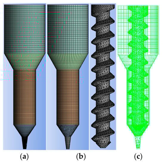Mesh results are shown in Figure 5. Since the middle region of the flow channel in the screw extrusion structure is continually covered by moving parts, preventing slurry extrusion flow in that area, this region was removed during simulation modeling to reduce the mesh element count and expedite computation. The dimensions of the removed regions were adjusted to match the root diameter of the screw. Additionally, a mesh overlay technique was adopted to combine the flow channel and screw meshes in the screw extrusion mechanism. This approach yielded a reliable and user-friendly mesh configuration, avoiding the need to create complex meshes for the interacting regions.